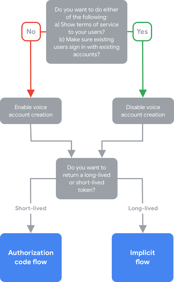 Kullanıcı ekransız bir cihaz kullanıyorsa Google, oturum açma işlemini tamamlamak için kullanıcıyı sesten ekrana aktarmayı gerektirdiğinden OAuth bağlantı türünün tek başına kullanılmasını önermez. Mevcut bir OAuth 2.0 sunucusu uygulamanız varsa ve jeton değişimi uç noktasını Google'ın kimlik jetonundan otomatik bağlama ve hesap oluşturma protokollerini destekleyecek şekilde genişletemiyorsanız bu akışı kullanabilirsiniz. Daha fazla bilgi edinmek için OAuth bağlama kavram rehberini inceleyin.