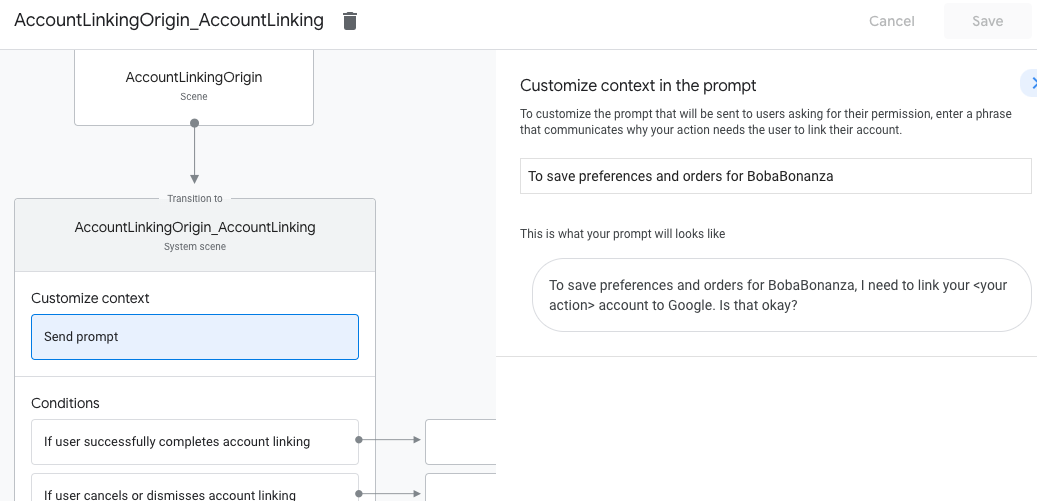- คลิกส่งพรอมต์ แล้วเพิ่มประโยคสั้นๆ เพื่ออธิบายให้ผู้ใช้ทราบ ว่าทำไมแอ็กชันจึงต้องเข้าถึงข้อมูลประจำตัวของผู้ใช้ (เช่น "เพื่อบันทึกค่ากำหนดของคุณ")