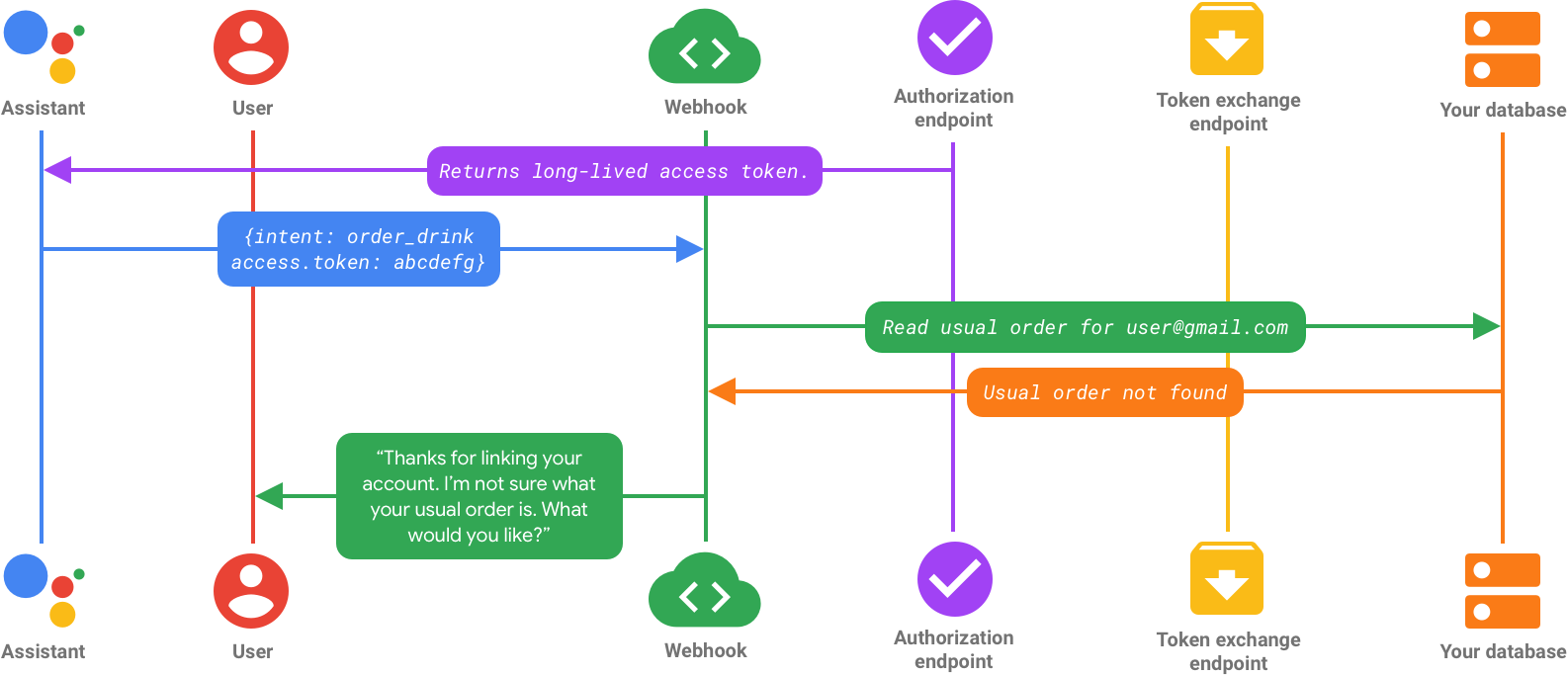 - Une fois que l'utilisateur a terminé le flux d'association de comptes, chaque requête ultérieure envoyée de l'Assistant à votre webhook de fulfillment contient un jeton d'accès.