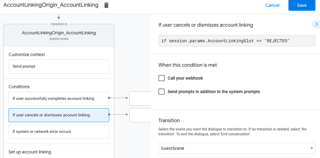 2. यह कॉन्फ़िगर करें कि अगर उपयोगकर्ता अपना खाता लिंक करने के लिए सहमत नहीं होता है, तो फ़्लो कैसे आगे बढ़ना चाहिए. उदाहरण के लिए, पुष्टि करने वाला मैसेज भेजें और उपयोगकर्ताओं को उन सीन पर रीडायरेक्ट करें जिनमें खाते को लिंक करने की ज़रूरत नहीं होती.