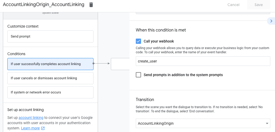 2. अगर उपयोगकर्ता अपना खाता लिंक करने के लिए सहमत होता है, तो फ़्लो को आगे बढ़ाने का तरीका कॉन्फ़िगर करें. उदाहरण के लिए, कारोबार के लिए ज़रूरी कस्टम लॉजिक को प्रोसेस करने के लिए, वेबुक को कॉल करें. साथ ही, वापस ओरिजनल सीन पर जाएं.