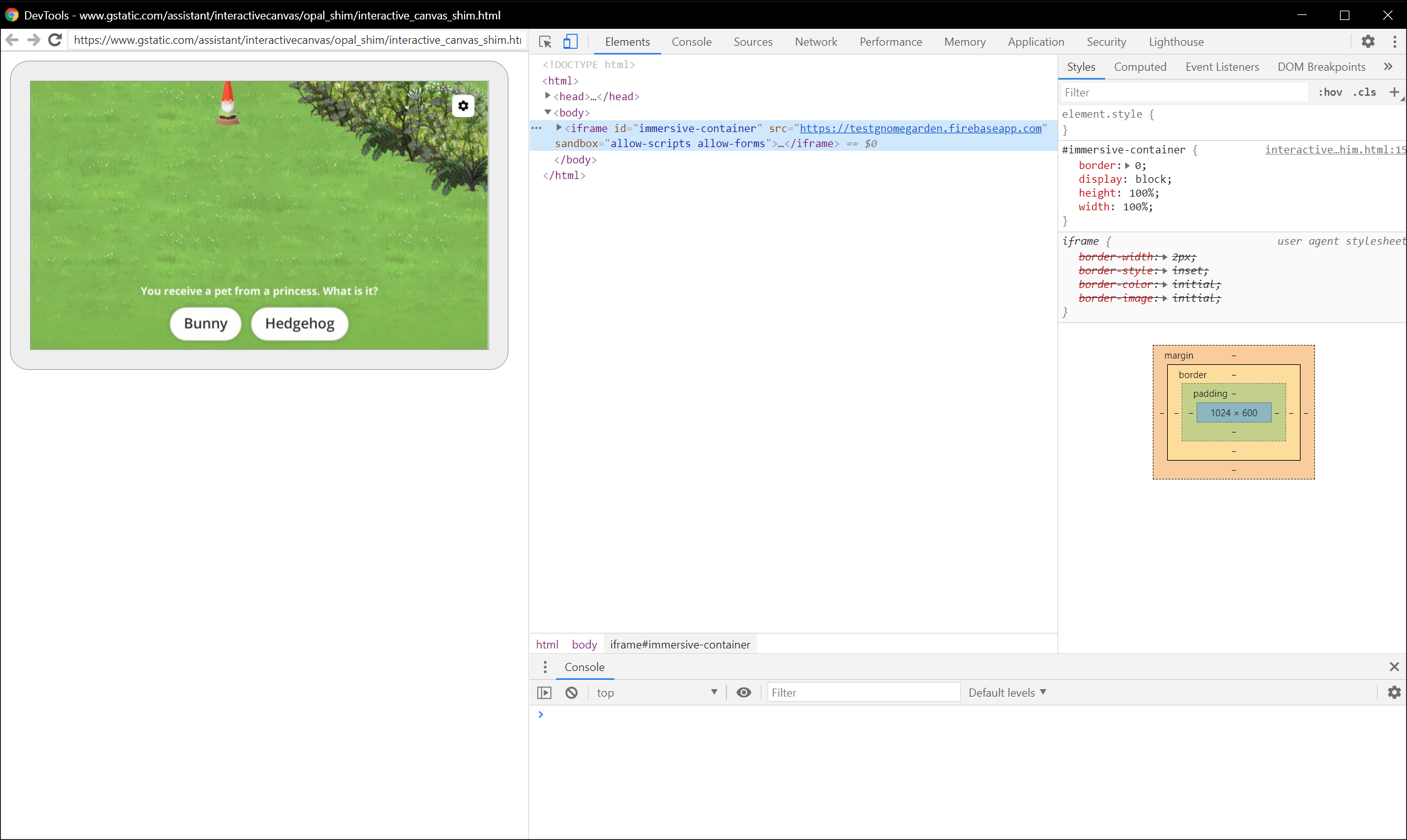 Seu app da Web Canvas é carregado em um iframe.
