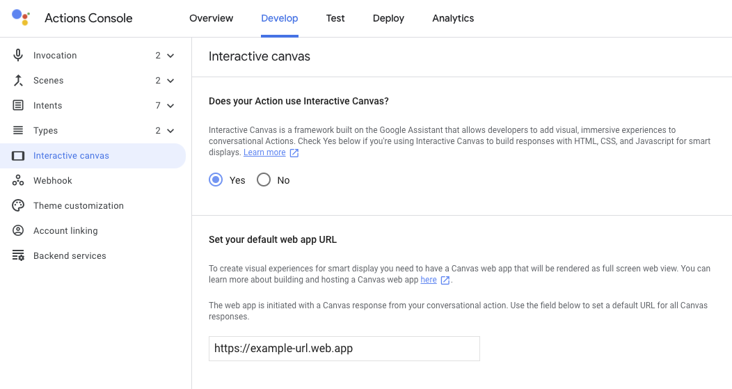 - 左側のナビゲーションで [Interactive Canvas] をクリックします。
