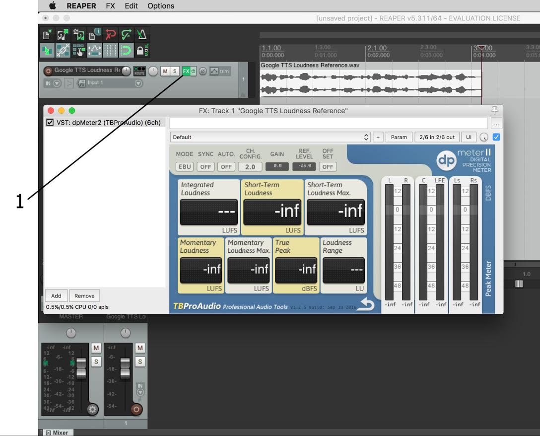 - 设置数字音频工作站 (DAW) 和 LUFS 计量表 来测量相较于 Google TTS 音量参考。