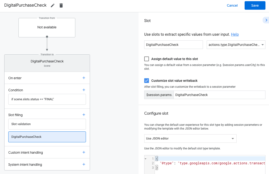Actions Builder에서는 대신 JSON 편집기를 사용하여 슬롯을 구성할 수 있습니다. 위의 순서 객체로 대체합니다. 두 구현 모두 CompletePurchaseValueSpecJSON 웹훅 페이로드 참조.