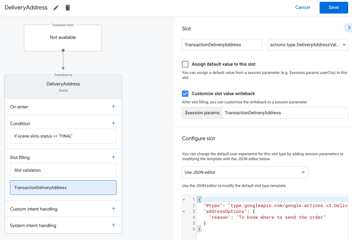 actions.type.DeliveryAddressValueas the slot type. - In the slot name field, give the slot the name