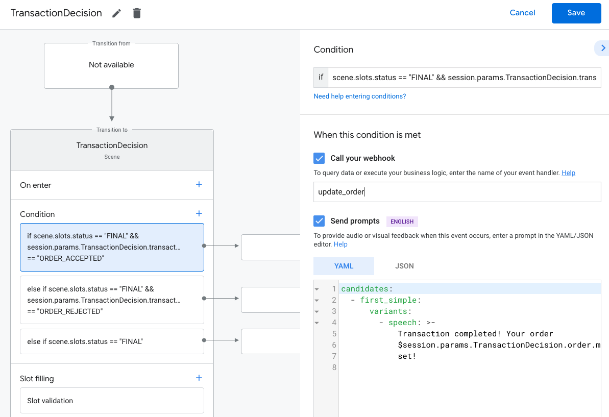 else if scene.slots.status == "FINAL".प्रॉम्प्ट भेजें चालू करें और उपयोगकर्ता को एक आसान सा प्रॉम्प्ट दें अगर वे लेन-देन नहीं कर पा रहे हैं, तो: