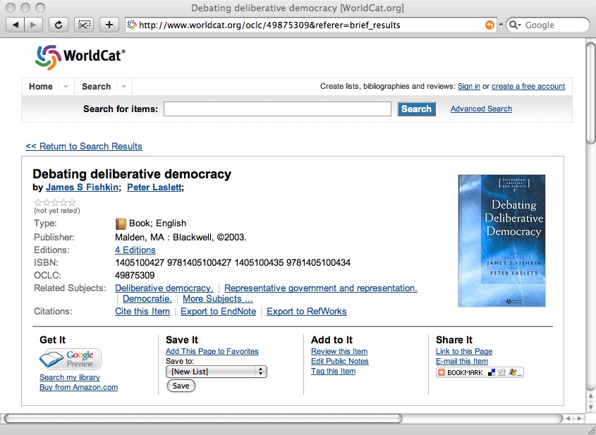 เป้าหมายของ OCLC คือการเพิ่มการค้นพบและการเข้าถึงห้องสมุดและคอลเล็กชันของห้องสมุดทั่วโลก ผู้คนใช้ WorldCat.org เพื่อค้นหา ประเมิน แสดงรายการ และทบทวนเนื้อหาในไลบรารีบนเว็บ การทำให้นักเรียนมีวิธีการง่ายๆ ในการเข้าถึงเนื้อหาฉบับเต็ม (หรือที่มีให้) ของผลงานที่พวกเขาสนใจผ่าน Google Book Search ถือเป็นการปรับปรุงชั้นยอดของกระบวนการค้นหาหนังสือใน WorldCat.org ฟีเจอร์ใหม่นี้ช่วยให้ผู้มีอุปการคุณค้นหาเนื้อหาในคลังผ่าน WorldCat.org ดูข้อความที่ Google นำเสนอผ่าน API และค้นหาสำเนาของรายการในคลังที่ใกล้ตัวที่สุดได้