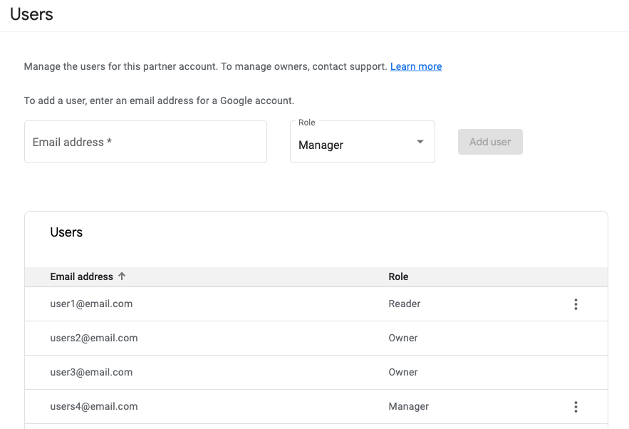 Die E-Mail-Adresse, mit der das Partnerkonto ursprünglich registriert wurde, hat die Rolle Inhaber.