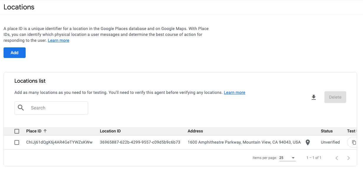 Use this page to add locations, retrieve test URLs for business locations, and verify locations once you've verified your agent.