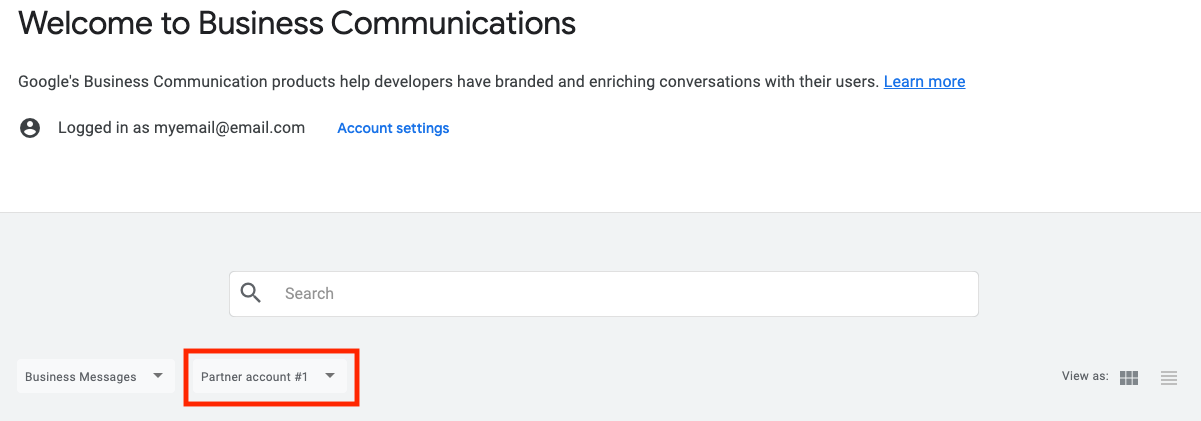 Business Messages bietet die Webbenutzeroberfläche Business Communications Developer Console. Mit dieser Konsole können Sie Agents erstellen, verwalten und starten.