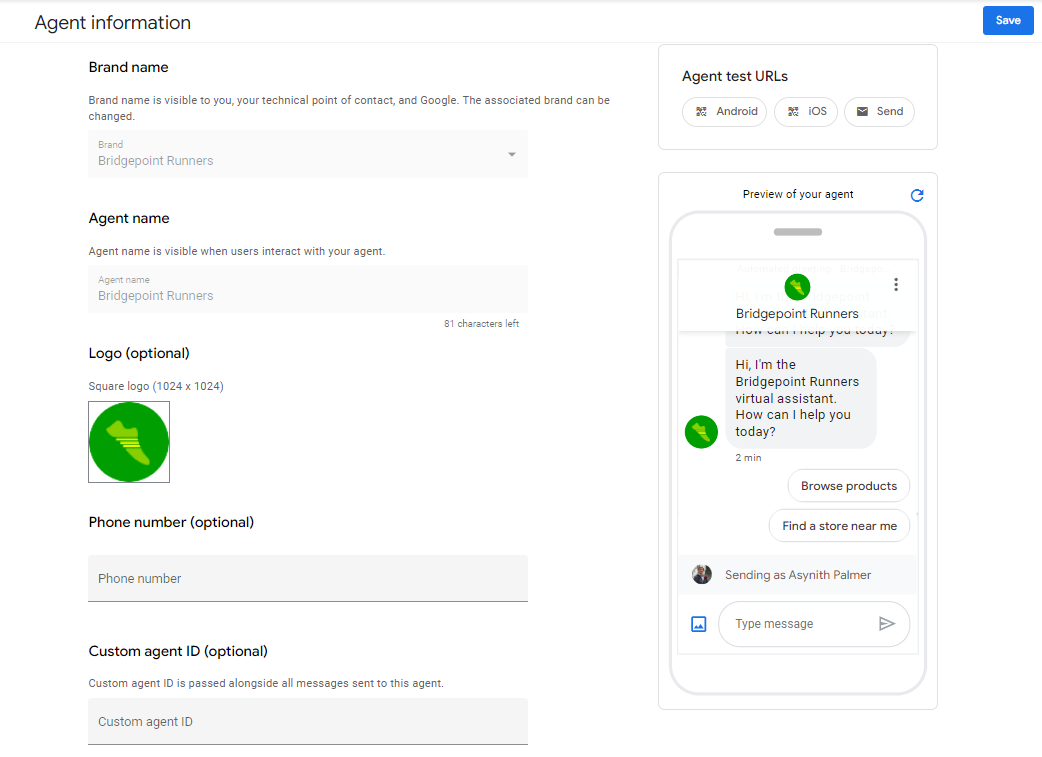 Utilizza la colonna di destra per ottenere gli URL di test per l'agente e visualizzare un'anteprima dell'agente sul dispositivo di un utente.