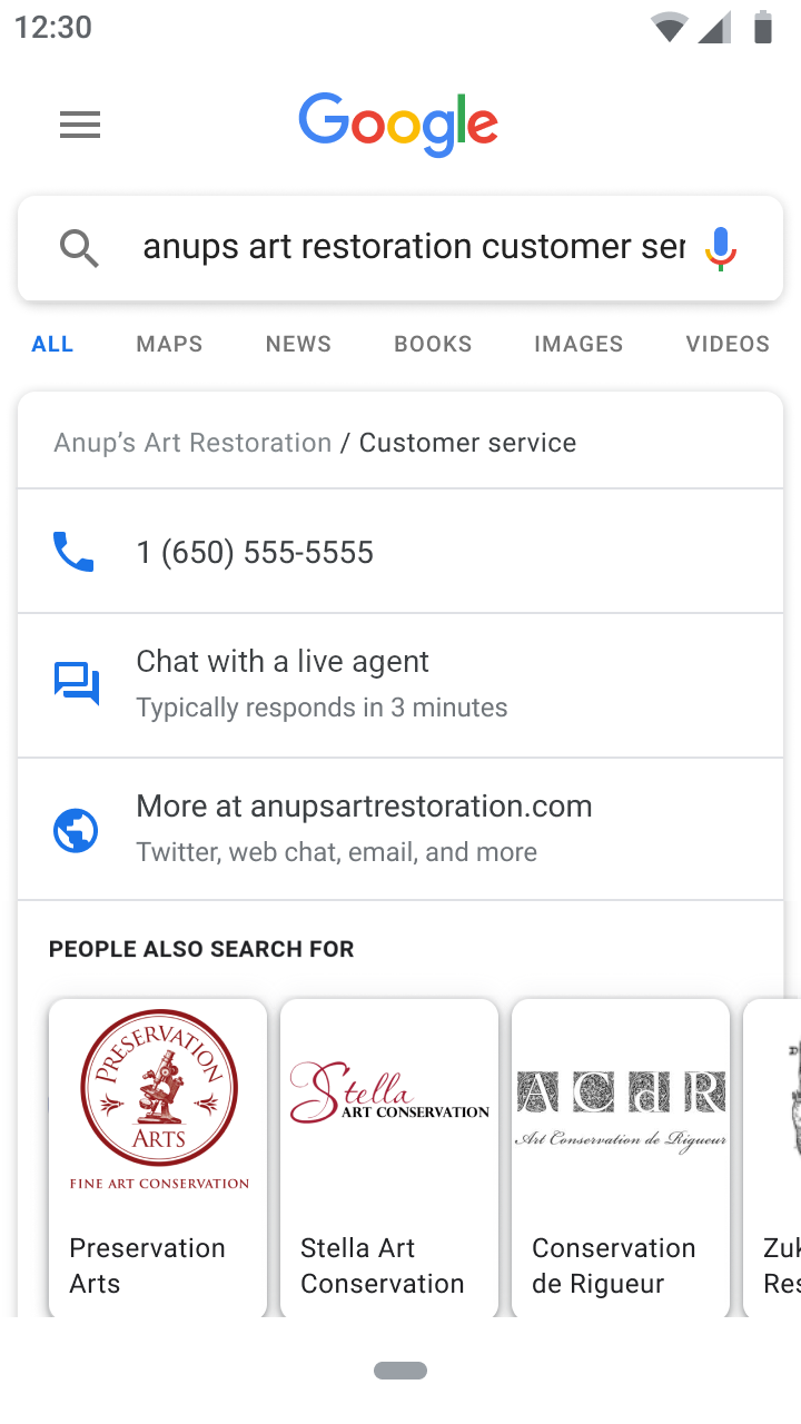 FEATURED_SNIPPETS 진입점을 사용하면 사용자가 Google 검색을 통해 연락처 세부정보를 찾을 때 에이전트와 대화할 수 있습니다.