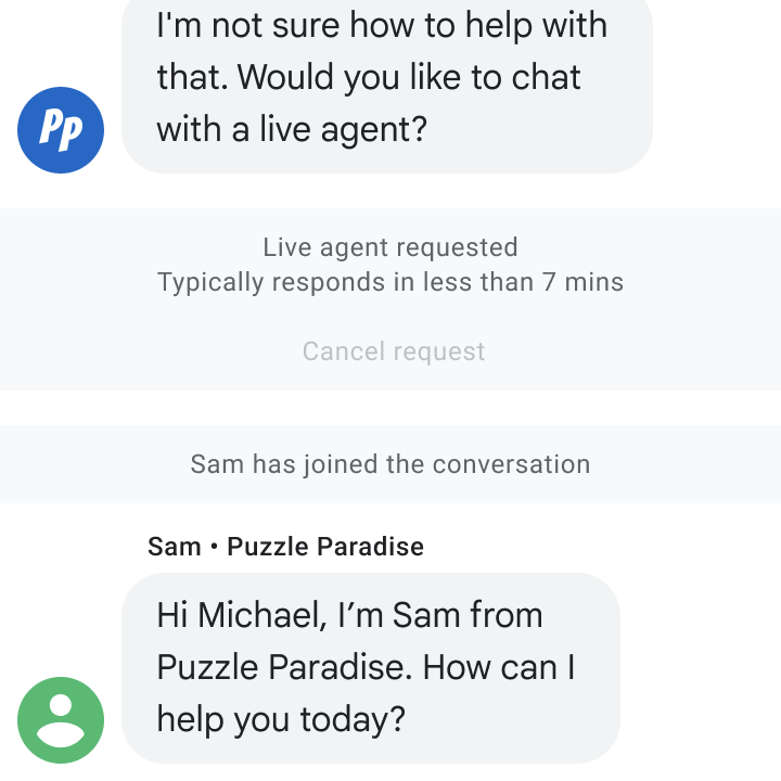 Tu agente puede cambiar entre respuestas humanas y automáticas en cualquier momento durante una conversación. Cuando realizas una transferencia a un agente humano, puedes enviar un evento a los usuarios para indicar que se unió o se fue un agente humano. Los usuarios también pueden solicitar que un agente en vivo se una a la conversación, lo que envía un tipo de evento especial a tu agente. Si el bot de chat de tu agente detecta que un agente en vivo sería apropiado para la conversación, el agente incluso puede enviar una acción sugerida al usuario para que solicite un agente en vivo.