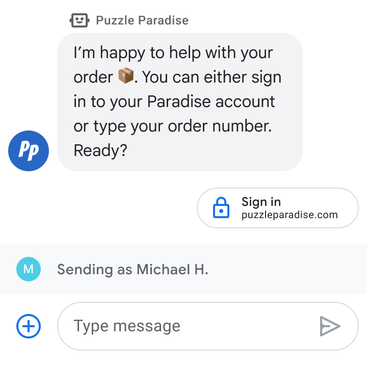 Gli agenti sono entità di conversazione con cui gli utenti interagiscono. Imposta il nome e il logo dell'agente in modo che riflettano il tuo brand e specifica messaggi di benvenuto e di inizio conversazione per indirizzare gli utenti agli argomenti supportati.Con la disponibilità dei messaggi, puoi specificare quando l'agente è disponibile. Business Messages supporta la risposta come agente in tempo reale o come bot e il passaggio da un tipo di rappresentante all'altro durante le conversazioni.