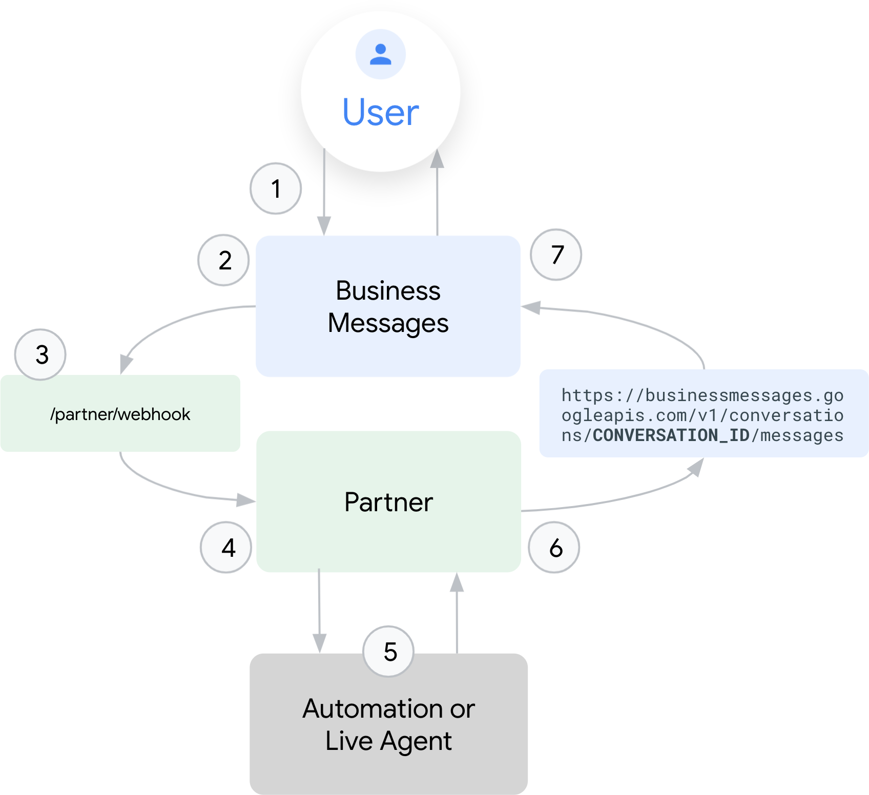 Messages are routed from the user to the partner's webhook through Business Messages, then handled by automation or live agents before a response is sent back to the user through Business Messages.
