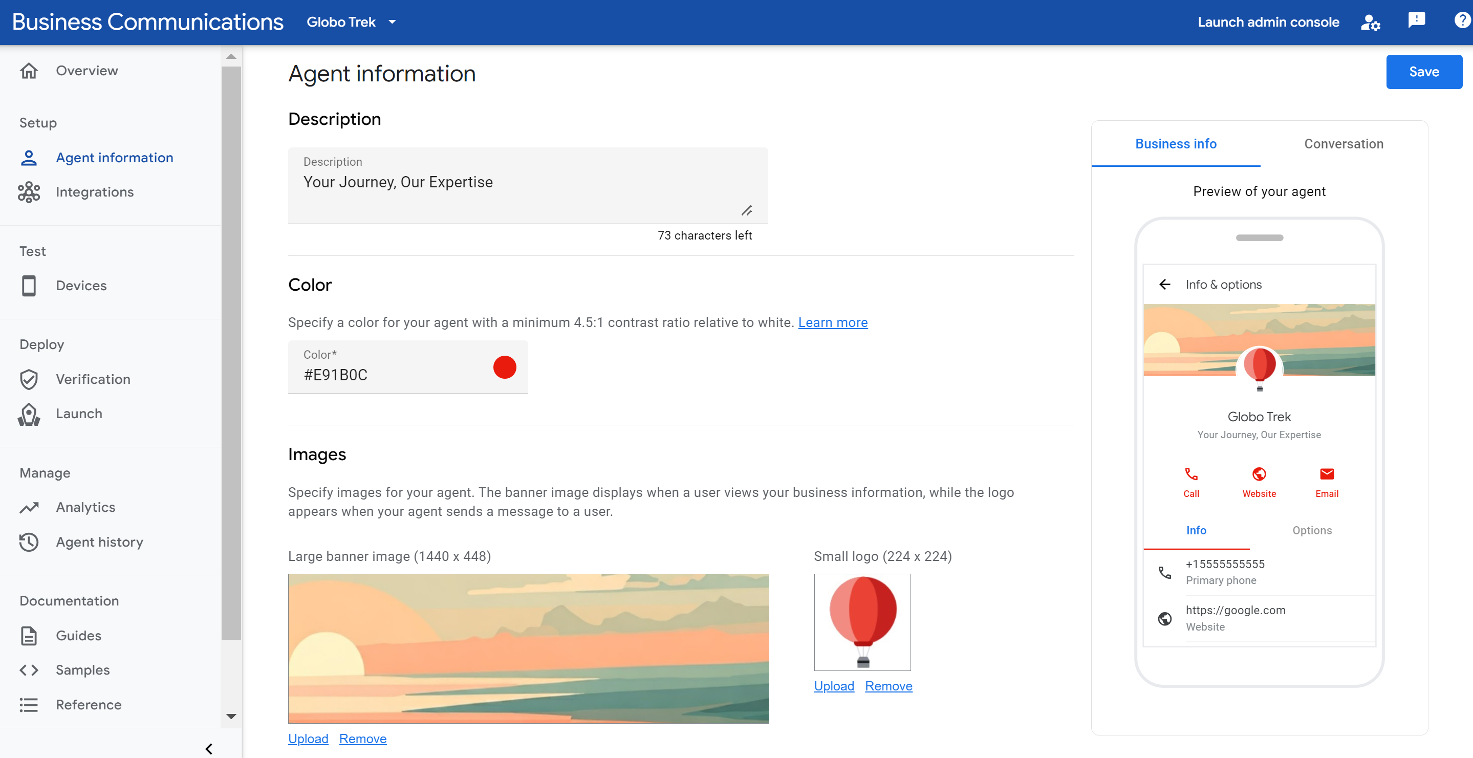 تعرض صفحتا نظرة عامة ومعلومات الوكيل معاينة لكيفية ظهور وكيلك في تطبيق "الرسائل".