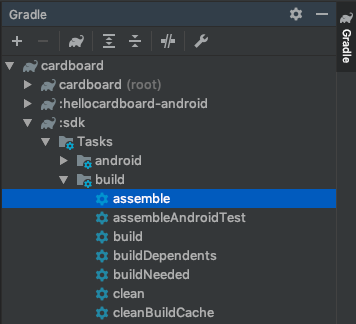 To assemble the Cardboard SDK, double-click the assemble option within cardboard/:sdk/Tasks/build folder in the Gradle tab (View > Tool Windows > Gradle).