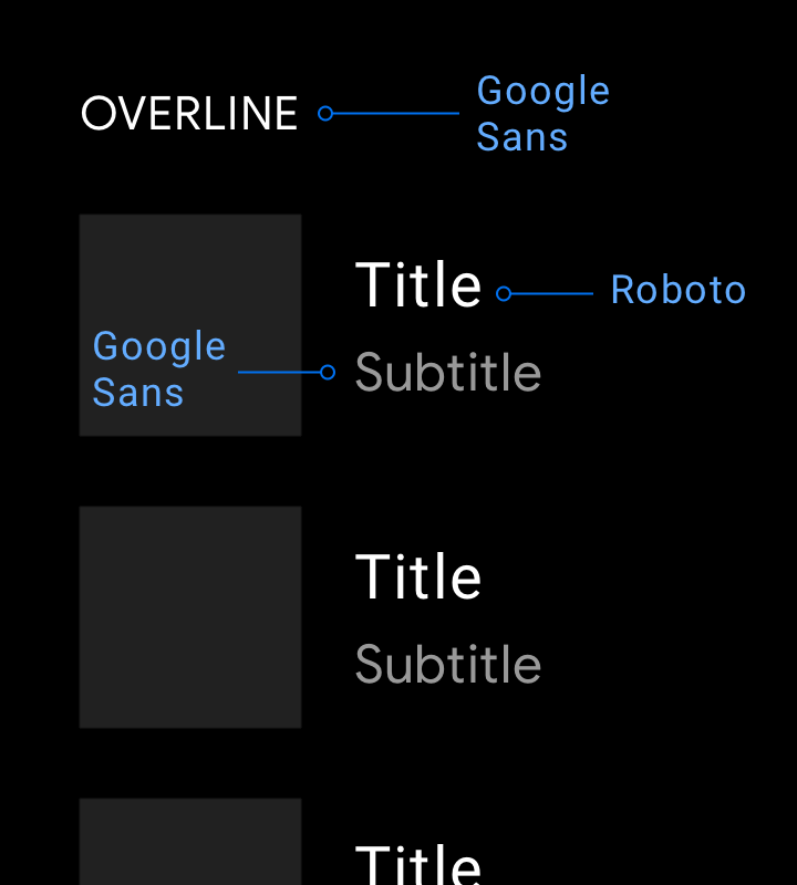 Google Sans should be used for type sizes 32dp and larger. Roboto is used everywhere else because it is legible in smaller sizes.