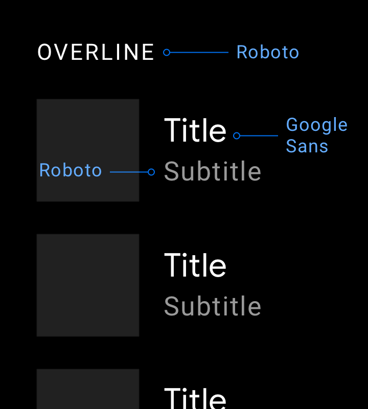 O Google Sans deve ser usado para tipos de tamanho de 32 dp ou maiores. O Roboto é usado em todos os outros lugares porque é legível em tamanhos menores.