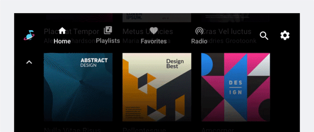 Wenn Nutzer im Inhaltsbereich stöbern, können sie ein durchsuchbares Inhaltselement wie ein Album oder eine Playlist auswählen, um eine detailliertere Ansicht dieses Inhalts (Titel auf dem Album oder einzelne Elemente der Playlist) aufzurufen. Wenn Nutzende auf diese Weise tiefer in den Inhaltsbereich eintauchen, wird oben auf dem Bildschirm ein App-Header angezeigt, einschließlich eines Angebots, über das die Nutzenden zur vorherigen Ebene zurückkehren können.
