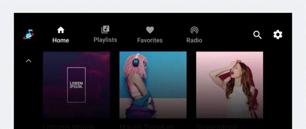 Medieninhalte können in einer Rasteransicht, einer Listenansicht oder einer Kombination aus beidem im selben Inhaltsbereich präsentiert werden. Inhalte können in Kategorien unterteilt werden, die durch Zwischenüberschriften getrennt sind. Nutzer scrollen durch die Raster oder Listen, indem sie vertikal scrollen.
