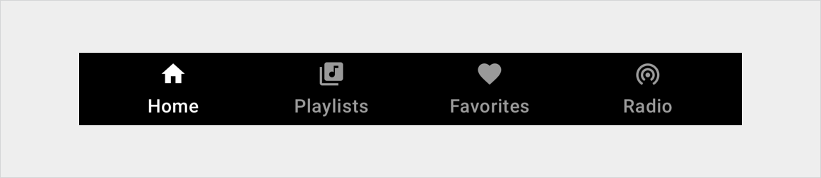 โดยทั่วไปแล้ว การนําทางหลักสําหรับการดูเนื้อหาภายในแอปสื่อหนึ่งๆ ประกอบด้วยแท็บสูงสุด 4 แท็บในแถบแอป (เว้นแต่หน้าจอจะมีขนาดเล็กมากและไม่มีพื้นที่ที่จะแสดงแท็บ) แท็บเหล่านี้ช่วยให้ผู้ใช้เลื่อนไปมาด้านข้างระหว่างการดูเนื้อหาที่ระดับบนสุดในลำดับชั้นของแอปได้