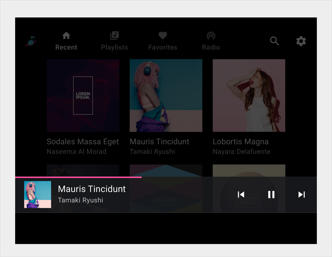 لبدء التشغيل، يختار المستخدم عنصرًا قابلاً للتشغيل في مساحة المحتوى، مثل ألبوم أو أغنية، وتشغل طريقة عرض التشغيل مساحة المحتوى بالكامل. تعرض طريقة عرض التشغيل البيانات الوصفية وعناصر التحكم في التشغيل للمحتوى المحدد. يمكن للمستخدمين التحكم في التشغيل باستخدام عناصر التحكم هذه وأيضًا باستخدام الإيماءات.