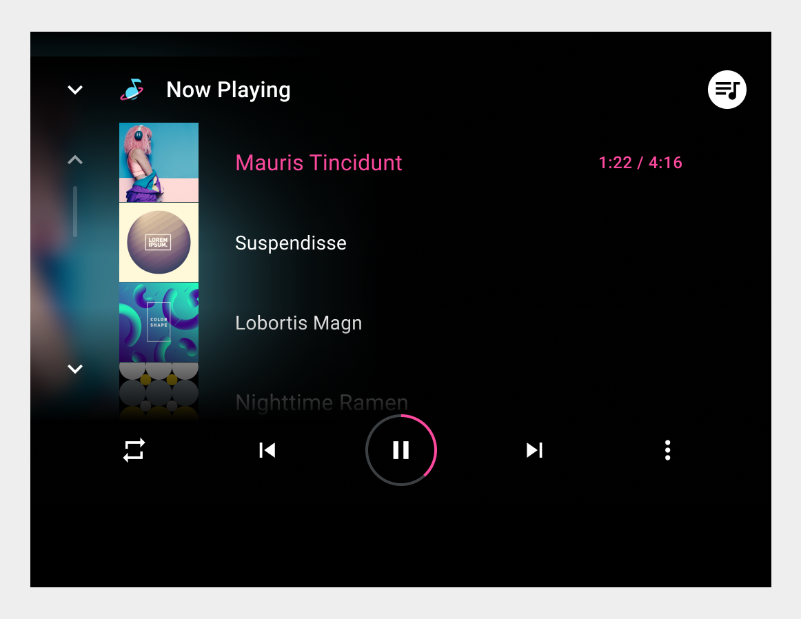 सूची में कम से कम हर आइटम का शीर्षक दिखता है. ऐप्लिकेशन डेवलपर हर वीडियो के लिए थंबनेल भी उपलब्ध करा सकते हैं. इसके अलावा, वे इस समय चल रहे आइटम को दिखाने के लिए एक आइकॉन भी उपलब्ध करा सकते हैं. यह आइकॉन उस आइटम के लिए बीते समय को दिखाकर भी दिखाया जा सकता है. हालांकि, कार बनाने वाली कंपनियां यह चुन सकती हैं कि इनमें से किसी आइटम को दिखाना है या छिपाना है: थंबनेल, आइकॉन या बीता हुआ समय.