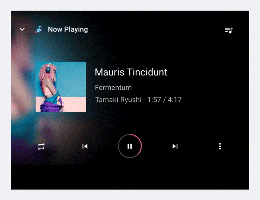 Per avviare la riproduzione, un utente seleziona un elemento riproducibile nello spazio dei contenuti, come un album o un brano, e la visualizzazione di riproduzione occupa l'intero spazio dei contenuti. La visualizzazione di riproduzione mostra i metadati e i controlli di riproduzione per i contenuti selezionati. Gli utenti possono controllare la riproduzione utilizzando questi controlli e anche con i gesti.