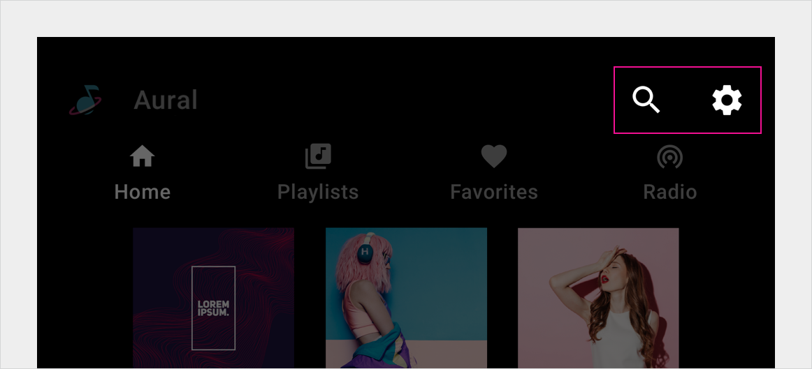 用户可以使用应用栏或应用标题上的应用控件来访问应用设置和应用内搜索功能。汽车制造商设计搜索叠加层,应用开发者通过 Android Automotive OS API 连接他们的内容。应用开发者为其应用设计设置叠加层和登录流程的各个方面。