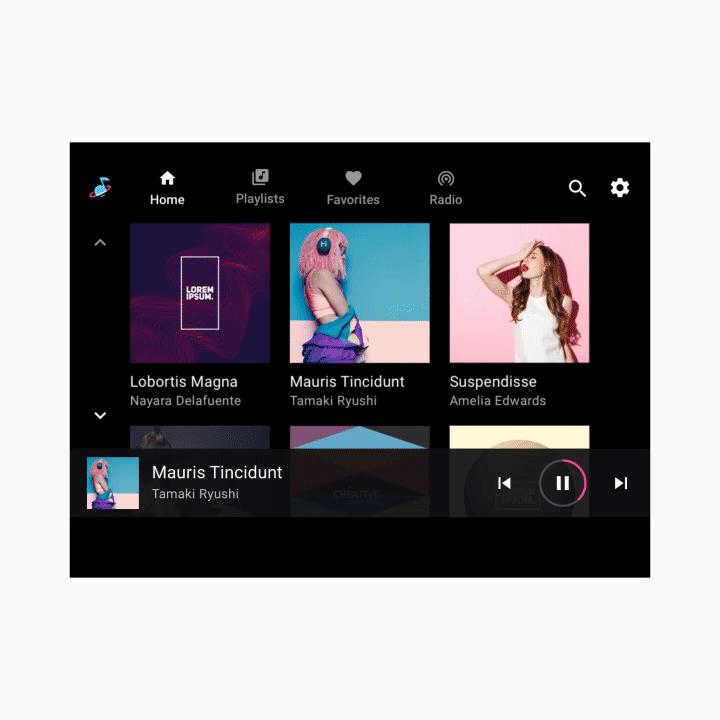 मीडिया कॉन्टेंट के इन टॉप-लेवल व्यू को नेविगेट करने के लिए, उपयोगकर्ता ऐप्लिकेशन बार में होम पेज और प्लेलिस्ट जैसे टैब चुन सकते हैं.
