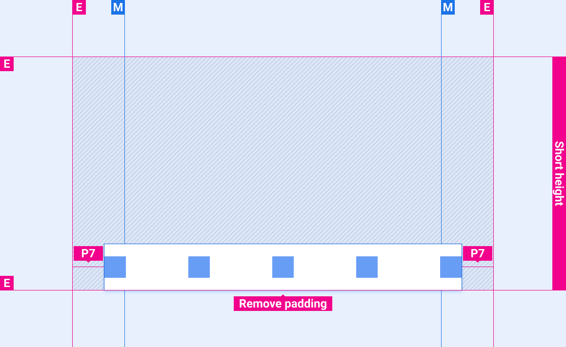 На экранах стандартной ширины расположите панель управления по центру по горизонтали. Панель управления выйдет за пределы. На экране стандартной ширины ровно 690 dp, как в этом примере, используйте боковые отступы P5 между краями панели управления и краями экрана.