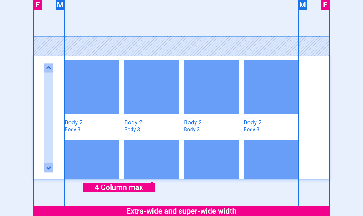 이러한 참조 레이아웃은 다양한 너비와 높이의 화면을 수용하도록 그리드를 조정하는 방법을 보여줍니다. 너비 및 높이 카테고리는 레이아웃 섹션에 정의되어 있습니다. 다운샘플링 또는 업샘플링이 발생하기 전에 모든 픽셀 값은 렌더링된 픽셀입니다.