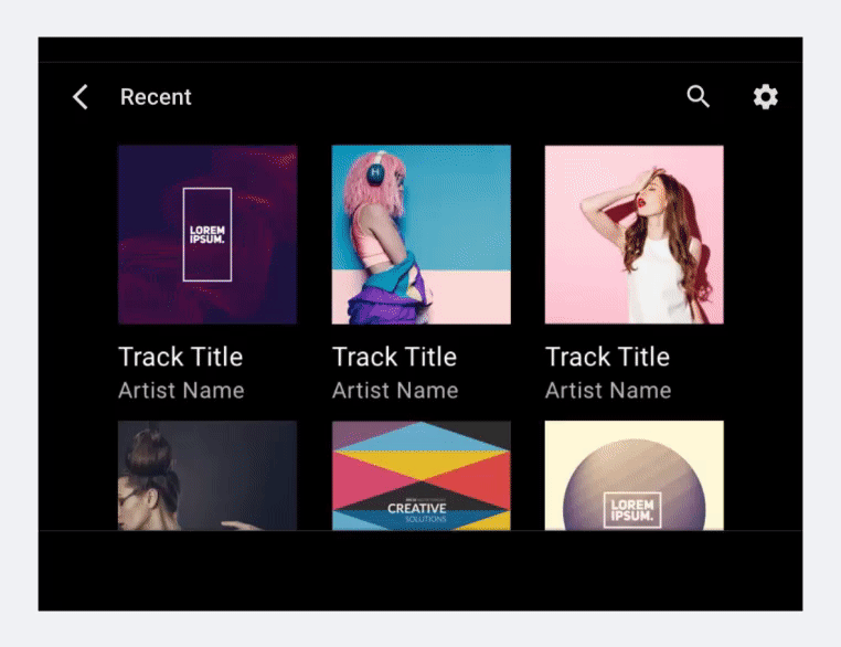 La vista de cuadrícula muestra dos o más columnas de imágenes que representan elementos de contenido, con texto breve debajo de cada imagen. Esta vista funciona mejor cuando los usuarios dependen principalmente de las imágenes para realizar sus selecciones.