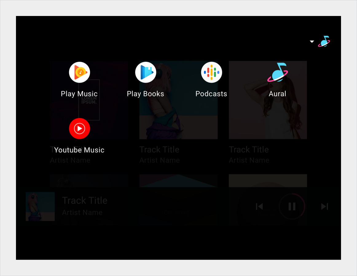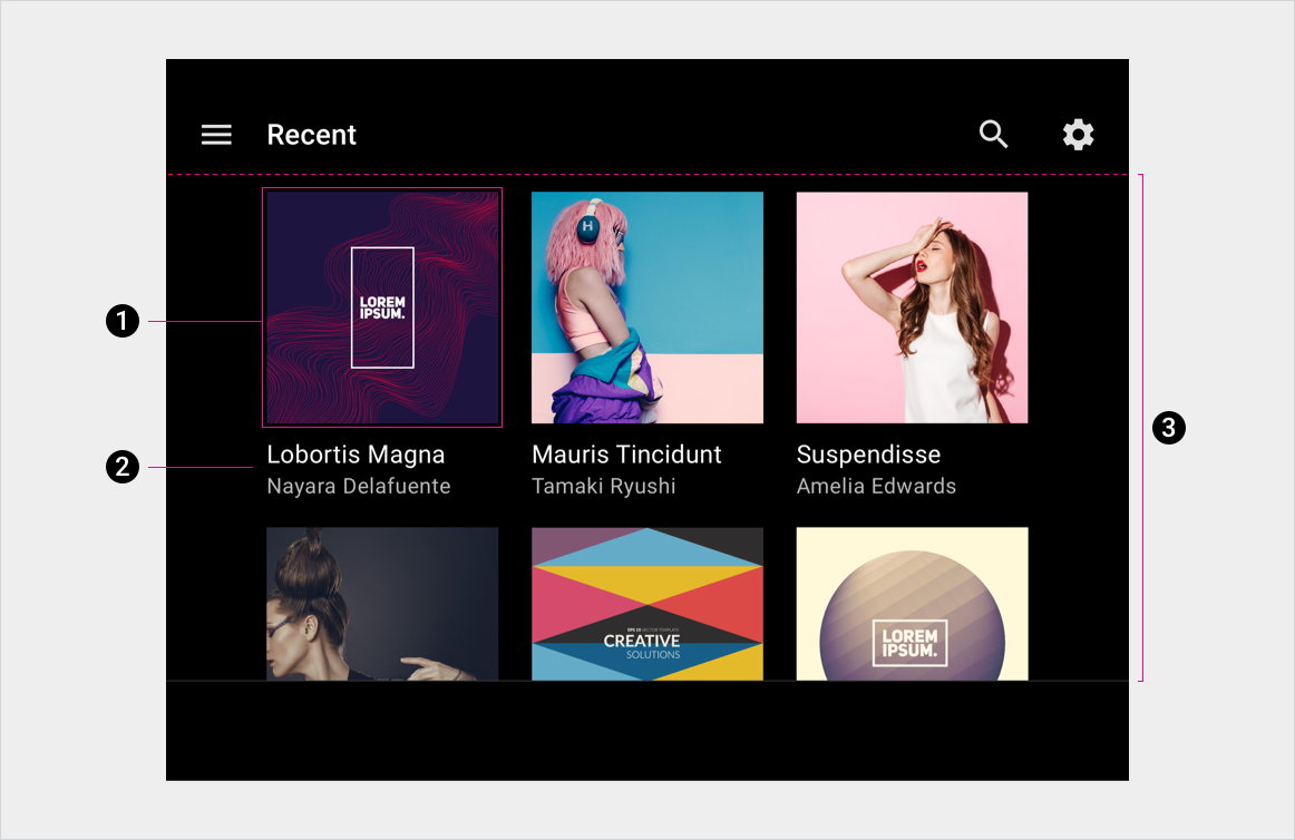 In einer Rasteransicht werden zwei oder mehr Spalten mit Bildern angezeigt, die Inhaltselemente darstellen. Unter jedem Bild wird ein kurzer Text angezeigt. Diese Ansicht eignet sich am besten, wenn Nutzer ihre Auswahl hauptsächlich anhand von Bildern treffen.