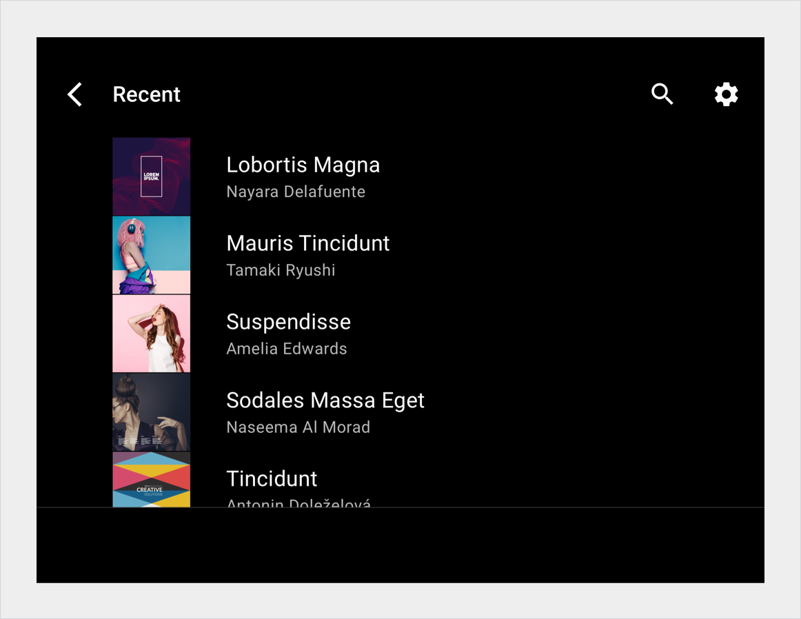 在列表视图中,每行都包含一个表示一个列表项的图块。主要操作可填充功能块,以便用户从功能块中的任何位置发起操作。对于由图标和文本表示的补充操作,只有包含图标和文本的区域才是可操作。