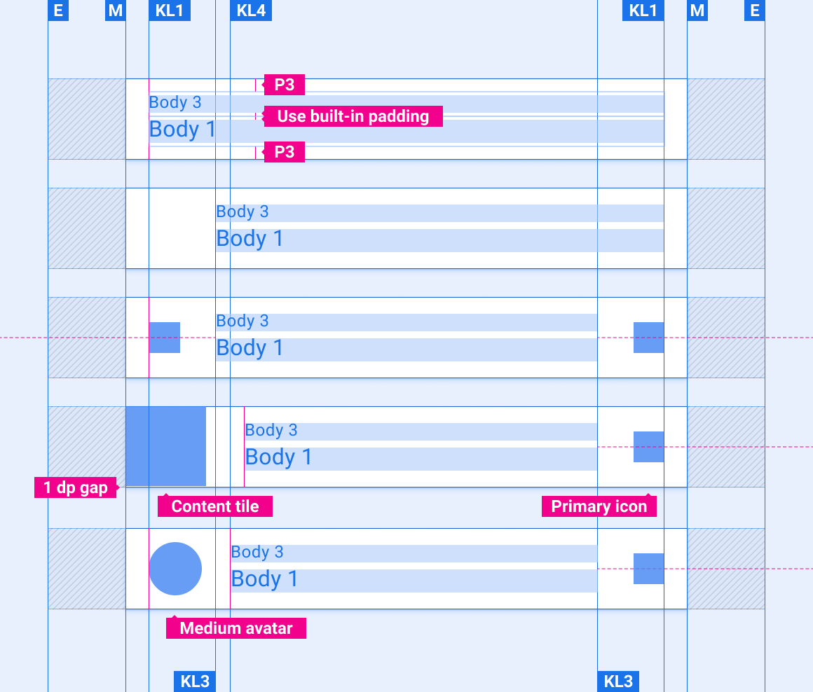 These reference layouts show how to adapt list items to accommodate screens of various widths and heights. (Width and height categories are defined in the Layout section.) Note that all pixel values are in rendered pixels, before any down-sampling or up-sampling occurs.
