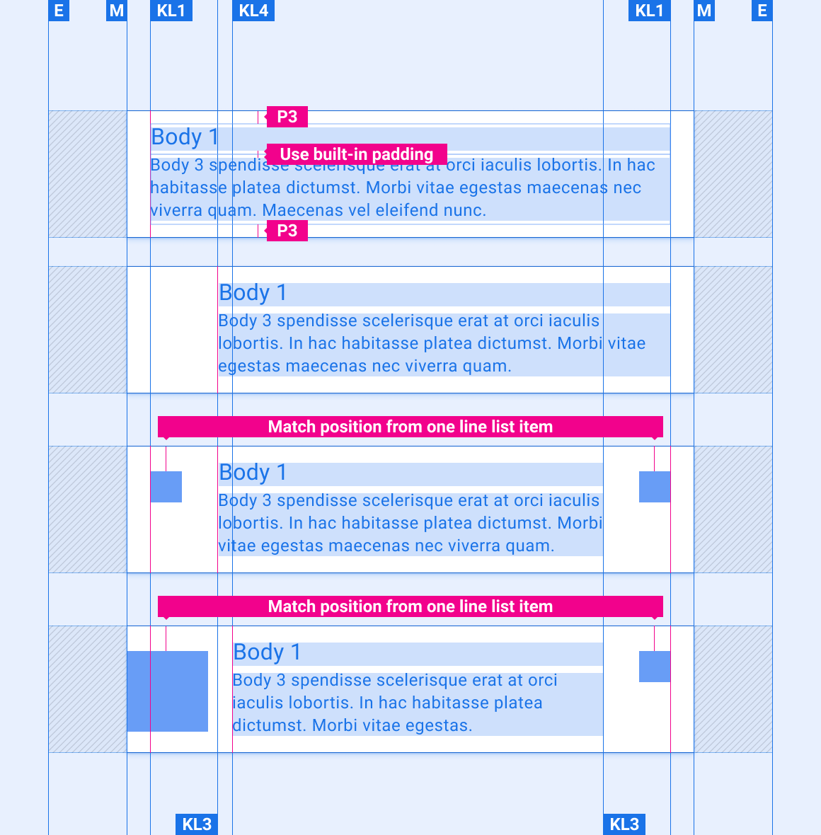 These reference layouts show how to adapt list items to accommodate screens of various widths and heights. (Width and height categories are defined in the Layout section.) Note that all pixel values are in rendered pixels, before any down-sampling or up-sampling occurs.