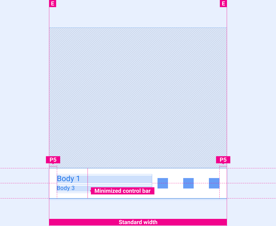 Estos diseños de referencia muestran cómo adaptar la barra de control minimizada para adaptarse a pantallas de varios anchos y alturas. Las categorías de ancho y altura se definen en la sección Diseño. Ten en cuenta que todos los valores de píxeles están en píxeles renderizados, antes de que se realice cualquier reducción o sobremuestreo.