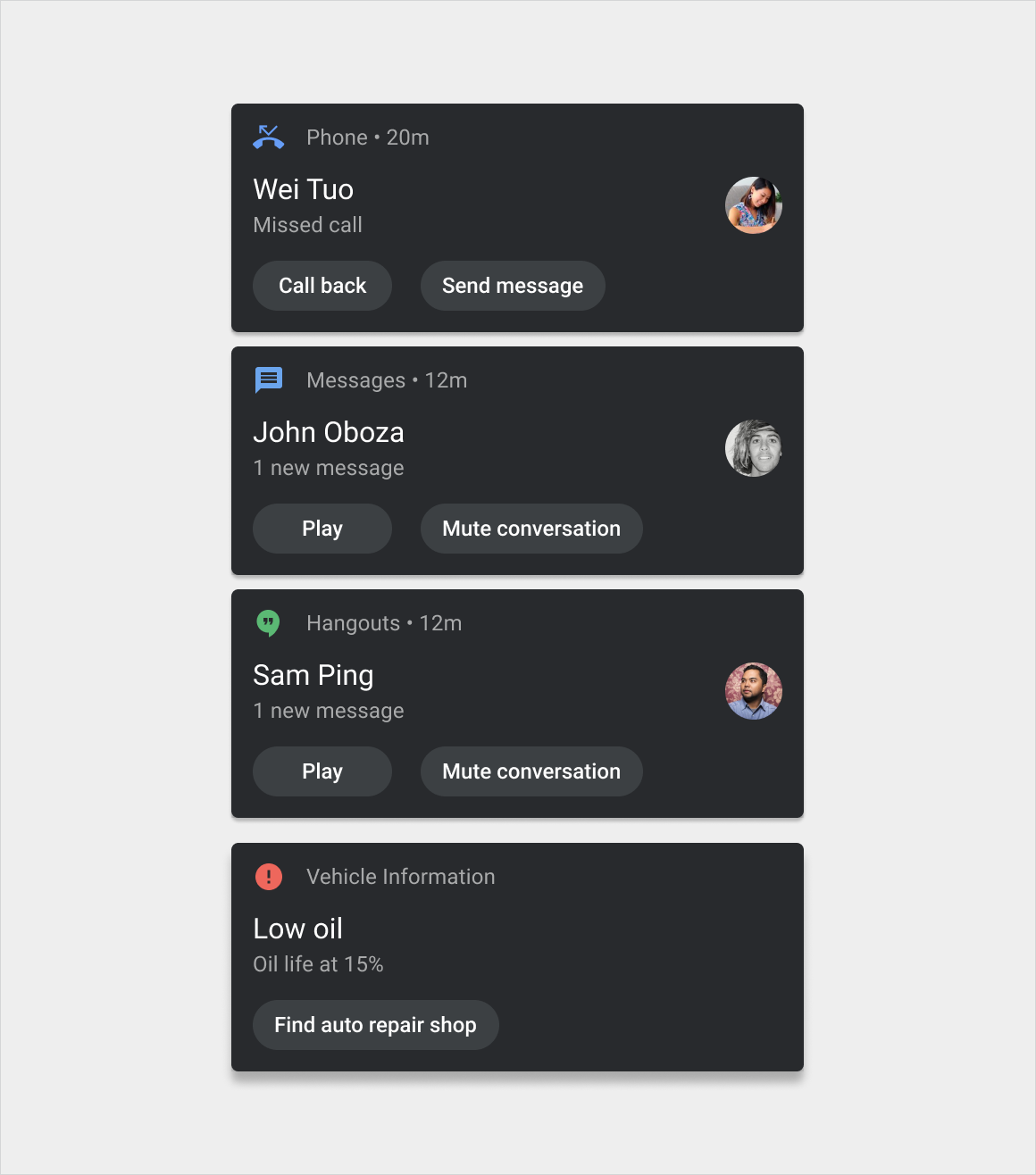 Dans ces versions, les conceptions peuvent également varier légèrement en fonction de la catégorie du message. Par exemple, les notifications d’appel ont des boutons et des icônes différents de ceux des notifications de navigation.