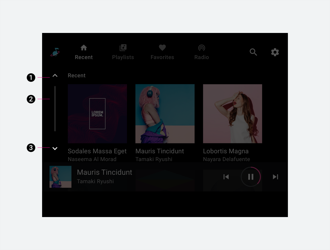 스크롤바는 위로 스크롤 및 아래로 스크롤 어포던스와 스크롤 진행률 표시기로 구성됩니다. 셰브론은 스크롤 어포던스에서 스크롤 방향을 나타내는 데 사용됩니다. 스크롤 진행률 표시기는 페이지의 총 콘텐츠 양과 관련하여 표시되는 콘텐츠와 스크롤 위치를 나타내는 선택적 요소입니다.