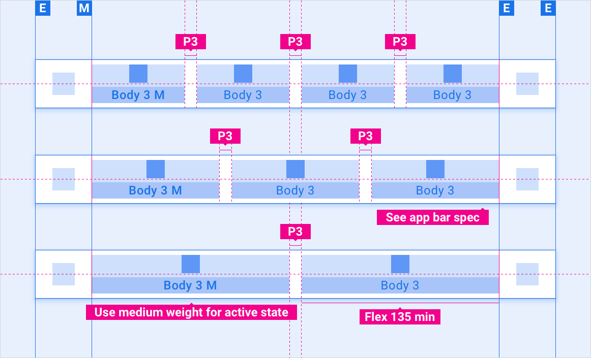 Estos diseños de referencia muestran cómo adaptar pestañas para adaptarse a pantallas de varios anchos y alturas. Las categorías de ancho y altura se definen en la sección Diseño. Ten en cuenta que todos los valores de píxeles están en píxeles renderizados, antes de que se realice cualquier reducción o sobremuestreo.