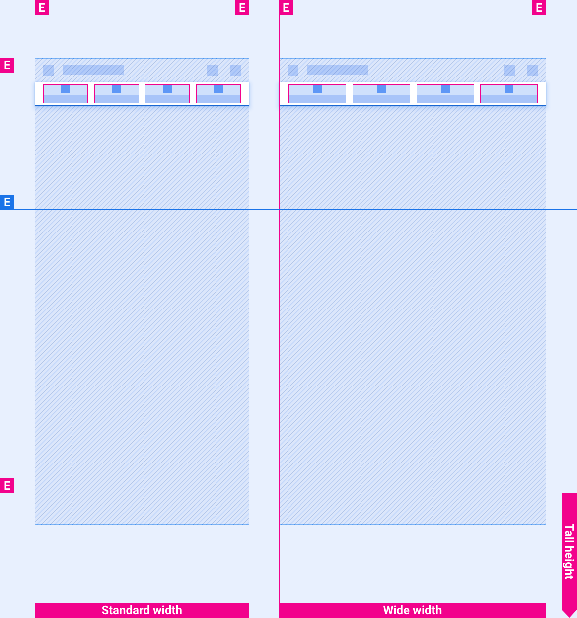 Estos diseños de referencia muestran cómo adaptar pestañas para adaptarse a pantallas de varios anchos y alturas. Las categorías de ancho y altura se definen en la sección Diseño. Ten en cuenta que todos los valores de píxeles están en píxeles renderizados, antes de que se realice cualquier reducción o sobremuestreo.