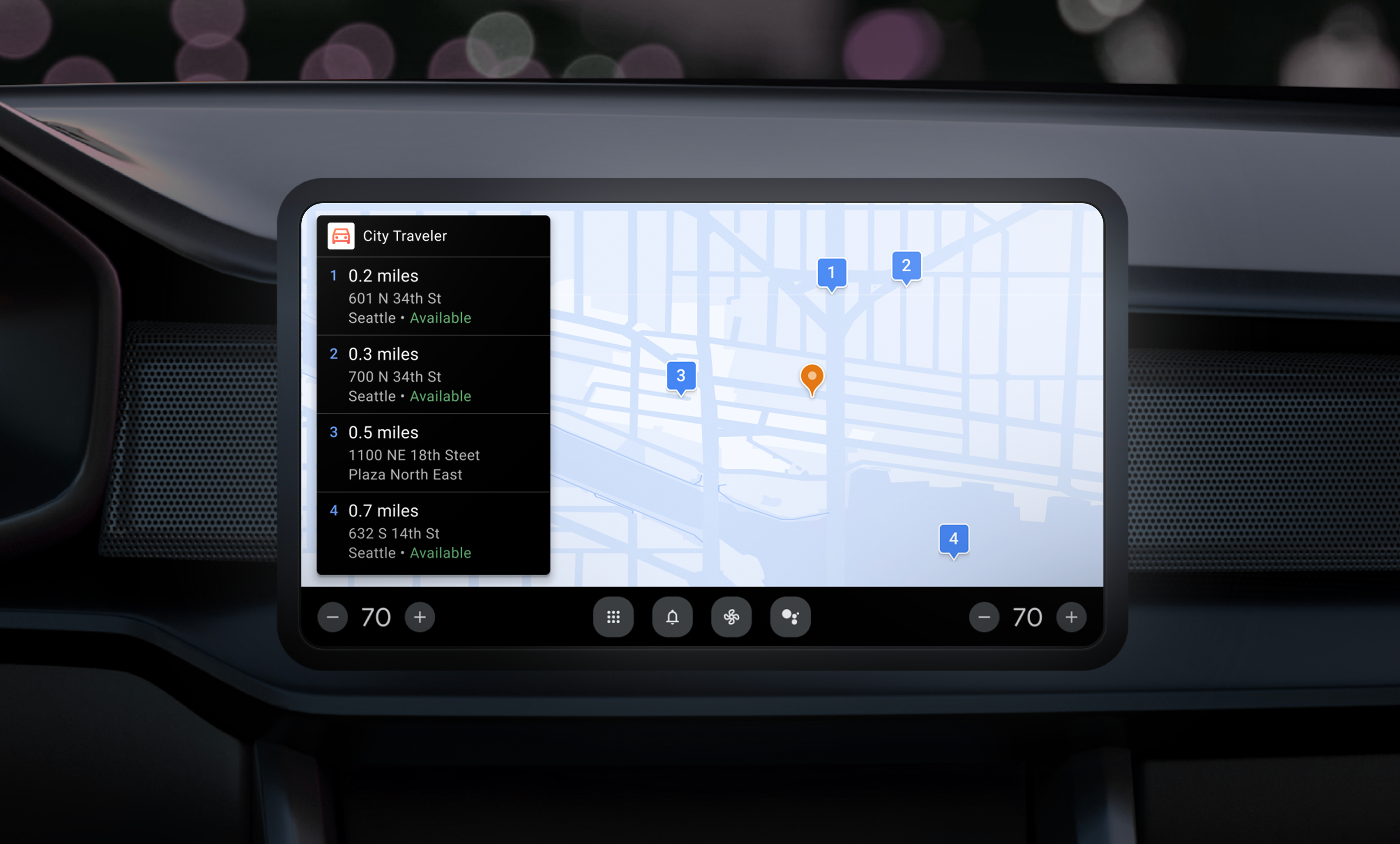 Android for Cars 提供了各种模板,可让您打造各种应用体验来帮助驾驶员完成旅程,包括查找停车和充电选项,以及在行车途中与家居设备通信。