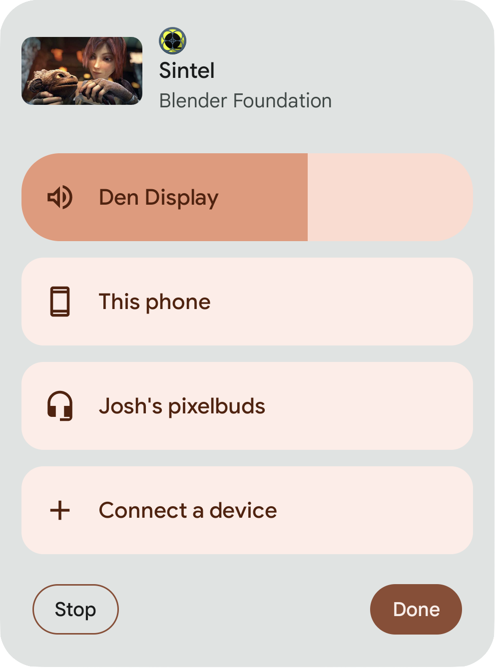 Il selettore di output supporta la possibilità di espandere la riproduzione a più speaker compatibili con Cast per le app audio utilizzando l'espansione dello streaming.