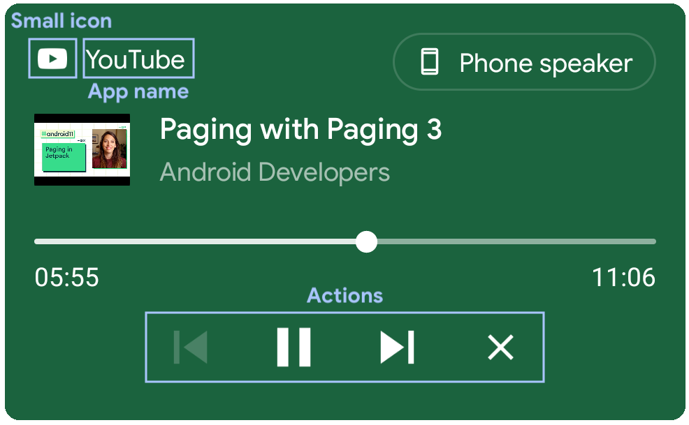 if (android.os.Build.VERSION.SDK_INT >= android.os.Build.VERSION_CODES.O) { // Create a media session. NotificationCompat.MediaStyle // PlayerService is your own Service or Activity responsible for media playback. MediaSession mediaSession = new MediaSession(this, "PlayerService"); // Create a MediaStyle object and supply your media session token to it. Notification.MediaStyle mediaStyle = new Notification.MediaStyle().setMediaSession(mediaSession.getSessionToken()); // Specify any actions which your users can perform, such as pausing and skipping to the next track. Notification.Action pauseAction = Notification.Action.Builder(pauseIcon, "Pause", pauseIntent).build(); // Create a Notification which is styled by your MediaStyle object. // This connects your media session to the media controls. // Don't forget to include a small icon. String CHANNEL_ID = "CHANNEL_ID"; Notification notification = new Notification.Builder(this, CHANNEL_ID) .setStyle(mediaStyle) .setSmallIcon(R.drawable.ic_app_logo) .addAction(pauseAction) .build(); }