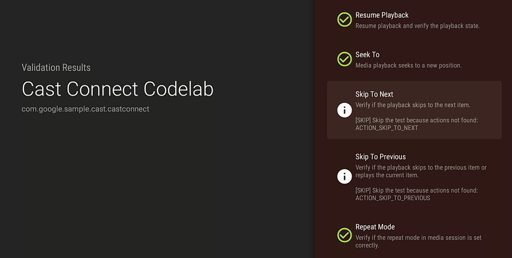 Media Session Validator هي أداة توفّر طريقة سهلة وتلقائية للتحقّق من دمج تطبيق Android TV مع Media Session. يؤدي ذلك أيضًا إلى التحقّق من المتطلبات الأساسية لتوفير ميزة Cast Connect في تطبيق Android TV.
