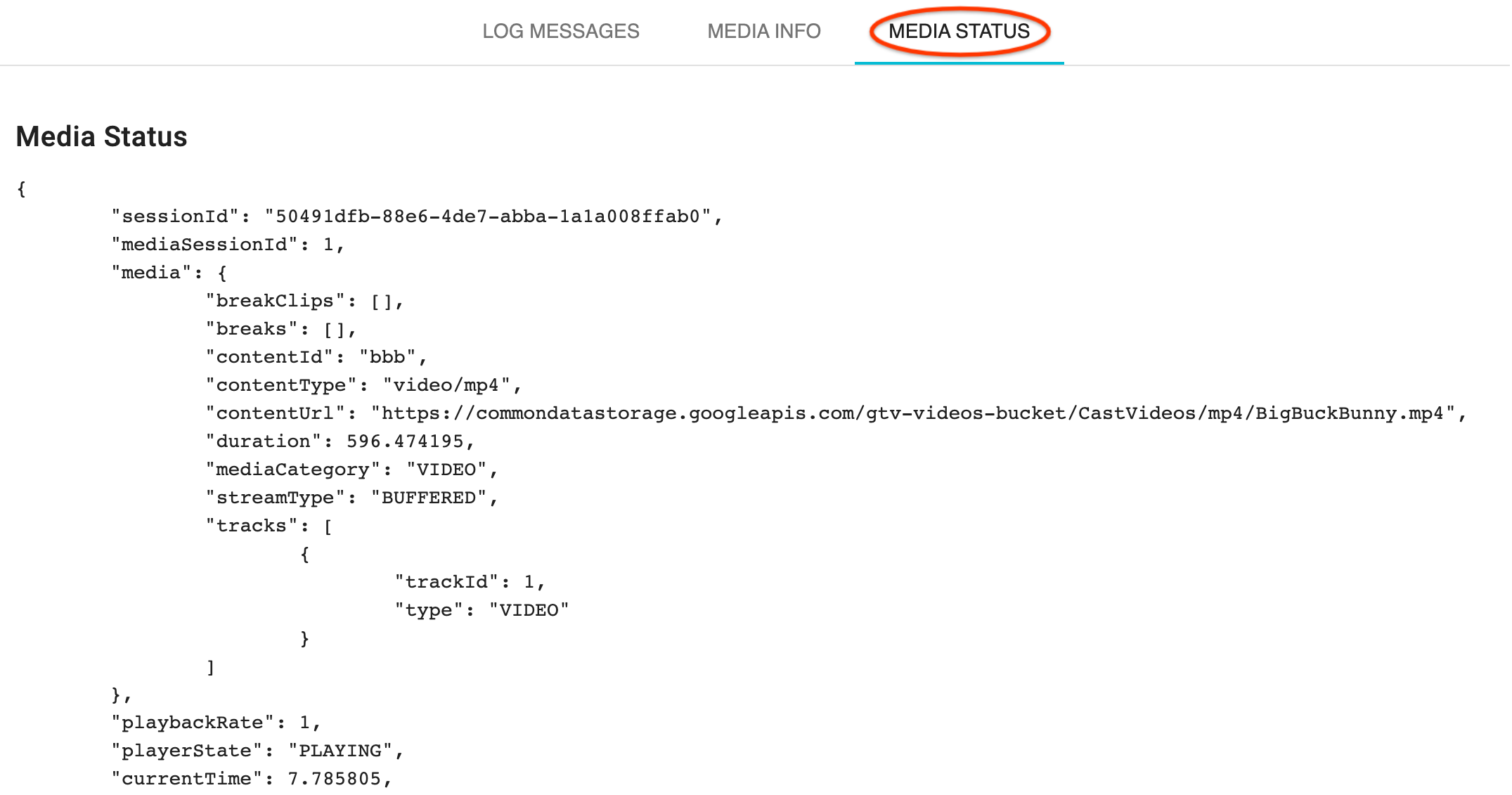 Lorsqu'une lecture de contenu multimédia démarre, l'outil CaC reçoit des messages d'état du contenu multimédia Web Receiver et les affiche dans l'onglet MEDIA STATUS (ÉTAT MULTIMÉDIA).