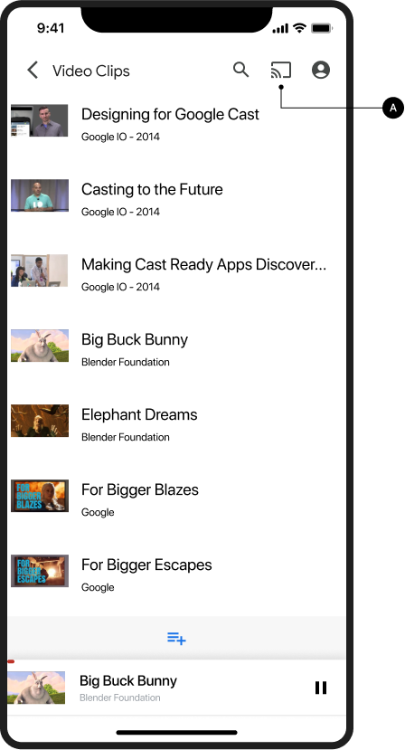 Google Cast, मल्टी-टास्किंग मॉडल का इस्तेमाल करता है. इससे उपयोगकर्ता, कास्ट करते समय भेजने वाले ऐप्लिकेशन और अन्य ऐप्लिकेशन ब्राउज़ कर सकते हैं. कास्ट करने का बटन, हर उस स्क्रीन पर दिखना चाहिए जिस पर वीडियो चलाया जा सकता है. इससे उपयोगकर्ता को यह ढूंढने में आसानी होगी कि टीवी पर चल रहे वीडियो को कहां से रोका या बंद किया जा सकता है.